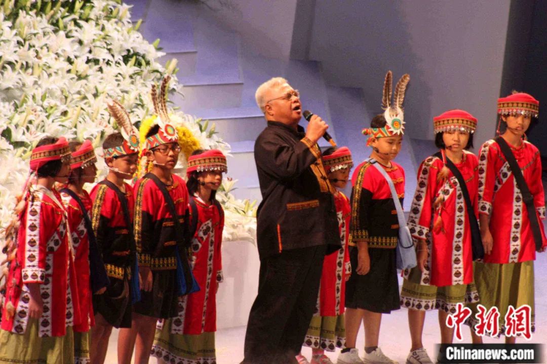 2009年9月,“88水災(zāi)”追悼大會(huì)在高雄市巨蛋舉行,約5000人與會(huì)。圖為臺(tái)灣著名歌手胡德夫帶領(lǐng)九個(gè)孩子出場,演唱歌曲悼念逝者,為受災(zāi)民眾祈福。董會(huì)峰 攝
