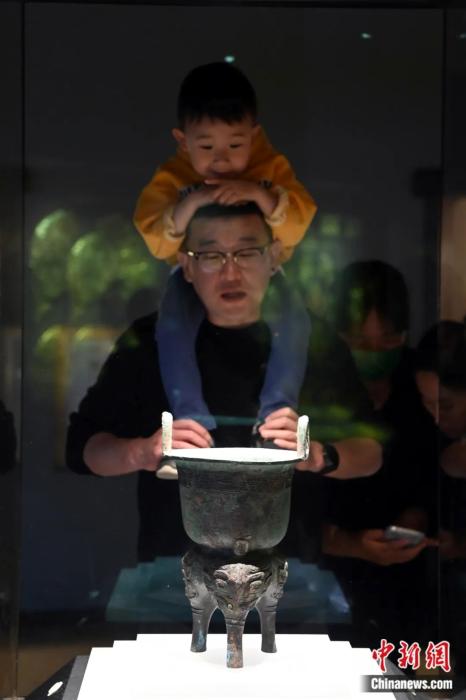 2023年4月29日,“五一”假期首日,一名小朋友在家長(zhǎng)的陪同下來(lái)到位于甘肅省蘭州市的甘肅省博物館參觀展出的西周獸面紋銅甗。九美旦增 攝