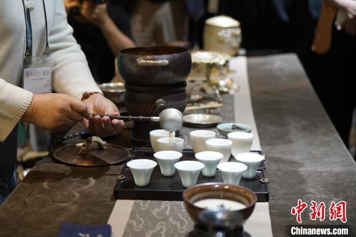 當?shù)貢r間23日,“茶和天下·雅集”活動開幕式暨茶韻山水——“綠水青山就是金山銀山”浙江省文旅圖片展在首爾中國文化中心舉行。圖為長興紫筍茶體驗。中新社記者 劉旭 攝