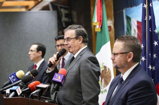 2019年8月5日,在美國得克薩斯州埃爾帕索的墨西哥駐埃爾帕索領事館,墨西哥外長埃布拉德(左三)在記者會上講話。新華社記者王迎攝