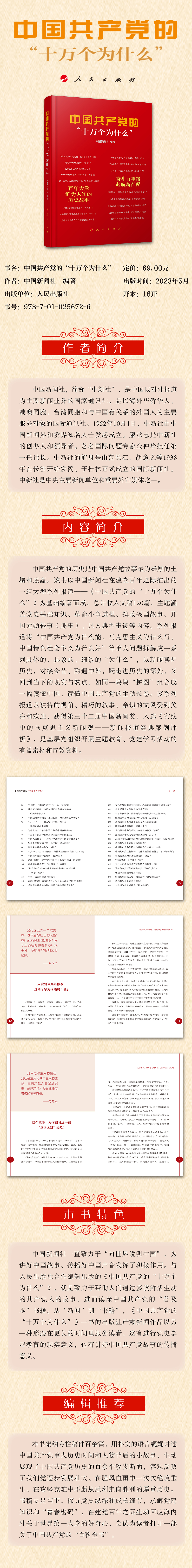 中國(guó)共產(chǎn)黨的歷史是中國(guó)共產(chǎn)黨故事最為雄厚的土壤和底蘊(yùn)。該書以中國(guó)新聞社在建黨百年之際推出的一組大型系列報(bào)道——《中國(guó)共產(chǎn)黨的“十萬(wàn)個(gè)為什么”》為基礎(chǔ)編著而成,總計(jì)收入文稿120篇,主題涵蓋黨史基礎(chǔ)知識(shí)、革命斗爭(zhēng)進(jìn)程、執(zhí)政興國(guó)故事、開國(guó)元?jiǎng)纵W事(趣事)、凡人典型事跡等內(nèi)容。系列報(bào)道將“中國(guó)共產(chǎn)黨為什么能、馬克思主義為什么行、中國(guó)特色社會(huì)主義為什么好”等重大問(wèn)題拆解成一系列具體的、具象的、細(xì)致的“為什么”,以新聞喚醒歷史,對(duì)接今昔、融通中外,既走進(jìn)歷史的深處,又回到當(dāng)下的現(xiàn)實(shí)與熱點(diǎn),如同一塊塊“拼圖”組合成一幅讀懂中國(guó)、讀懂中國(guó)共產(chǎn)黨的生動(dòng)長(zhǎng)卷。該系列報(bào)道以獨(dú)特的視角、精巧的敘事、親切的文風(fēng)受到關(guān)注和歡迎,獲得第三十二屆中國(guó)新聞獎(jiǎng),入選《實(shí)踐中的馬克思主義新聞?dòng)^——新聞報(bào)道經(jīng)典案例評(píng)析》,是基層黨組織開展主題教育、黨建學(xué)習(xí)活動(dòng)的有益素材和宣教資料。