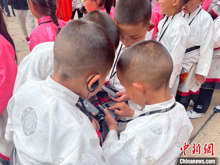 來自青海玉樹的俄金仁增,正在和小伙伴們擺弄語音講解器。袁秀月 攝