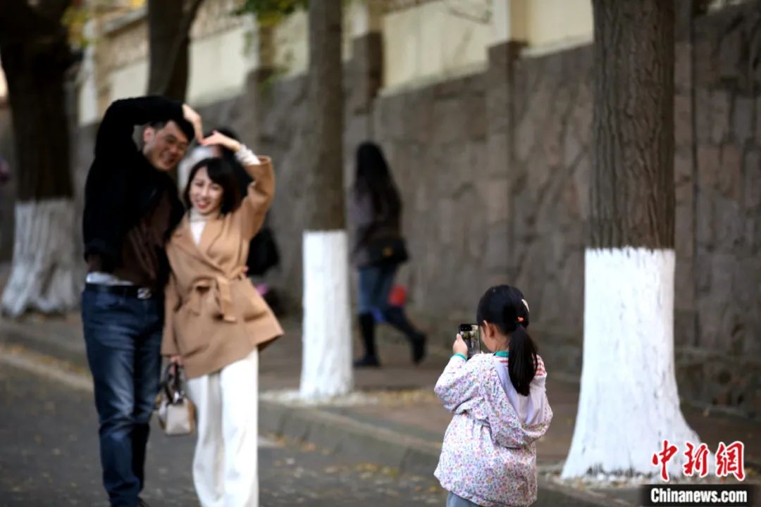 2022年11月,山東省青島市八大關(guān)景區(qū)居庸關(guān)路,一名兒童為父母拍照留念。蔡亞群 攝