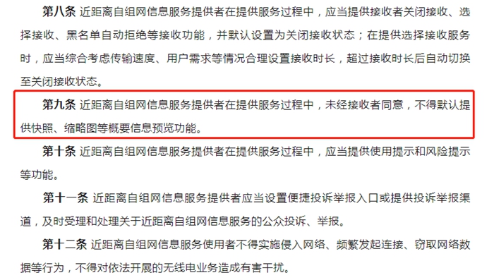 特別要注意的是,征求意見(jiàn)稿還提出“近距離自組網(wǎng)信息服務(wù)提供者在提供服務(wù)過(guò)程中,未經(jīng)接收者同意,不得默認(rèn)提供快照、縮略圖等概要信息預(yù)覽功能”。如前文所述,目前隔空投送存儲(chǔ)失敗選擇使用“文件”打開(kāi)時(shí),在未完全接收的情況下可顯示信息縮略圖。
