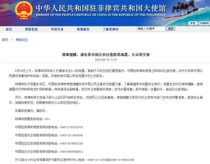 中新網(wǎng)6月16日電 據(jù)中國駐菲律賓大使館網(wǎng)站消息,6月15日上午,菲律賓呂宋島八打雁省發(fā)生6.2級地震,首都大馬尼拉地區(qū)震感強(qiáng)烈。中國駐菲律賓使館立即啟動應(yīng)急機(jī)制,及時為在菲中國公民提供領(lǐng)事保護(hù)和協(xié)助。目前,未接到有中國公民在地震中傷亡的報告。