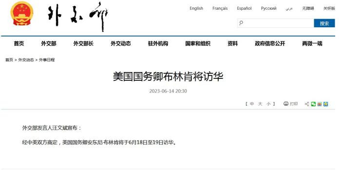 中新網(wǎng)6月14日電 據(jù)外交部網(wǎng)站消息,外交部發(fā)言人汪文斌宣布:經(jīng)中美雙方商定,美國(guó)國(guó)務(wù)卿安東尼·布林肯將于6月18日至19日訪華。