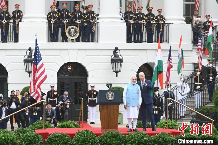 當(dāng)?shù)貢r(shí)間6月22日,印度總理莫迪對(duì)美進(jìn)行國事訪問。圖為美國總統(tǒng)拜登與莫迪出席白宮歡迎儀式。中新社記者 陳孟統(tǒng) 攝