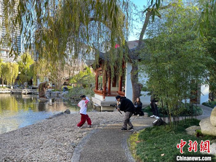 在湖邊,中國(guó)戲曲元素結(jié)合英文說唱的音樂吸引了游客們駐足。在悉尼從事汽修工作十余年的華人楊女士帶著兒子艾迪在湖邊拍攝音樂短視頻。穿著印有紅色京劇臉譜衛(wèi)衣的艾迪伴著動(dòng)感音樂起舞。“我非常喜歡這里中西結(jié)合的感覺。希望在公共場(chǎng)合拍攝能培養(yǎng)孩子的自信心?!睏钆空f。