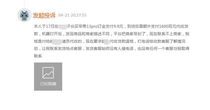 黑貓投訴平臺顯示,代收貨款相關投訴并不鮮見。有網(wǎng)友稱,在某電商平臺買蘋果手機支付訂金9.9元,到貨后額外支付1600元代收貨款,機器打開后,發(fā)現(xiàn)商品和商家描述不符,電商平臺把商家封了,快遞平臺讓聯(lián)系發(fā)貨地點客服,可根本聯(lián)系不上商家。