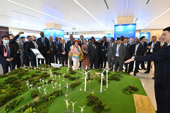 7月6日,駐華使節(jié)在國(guó)機(jī)集團(tuán)國(guó)際化經(jīng)營(yíng)成果展廳內(nèi)參觀由該集團(tuán)承建的肯尼亞基佩托風(fēng)電項(xiàng)目沙盤(pán)。新華社記者 李鑫 攝