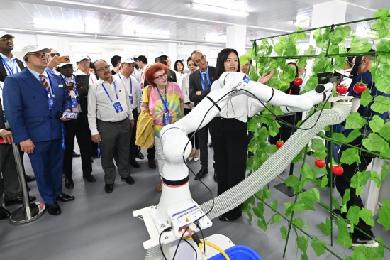 7月6日,駐華使節(jié)在國(guó)機(jī)集團(tuán)中國(guó)農(nóng)機(jī)院觀看番茄采摘機(jī)器人作業(yè)演示。新華社記者 李鑫 攝