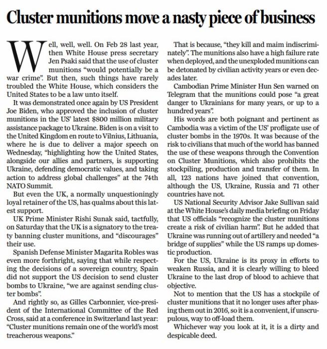 對(duì)美國(guó)來(lái)說(shuō),烏克蘭是削弱俄羅斯的代理人,為了這一目的,美國(guó)顯然愿意讓烏克蘭流盡最后一滴血。其次,美國(guó)擁有大量集束彈藥, 2016年起逐步淘汰一批,現(xiàn)在打著援助烏克蘭的旗號(hào)也是一種處理方式。因此,無(wú)論怎么看,這都是一種骯臟下流、卑鄙無(wú)恥的行徑。