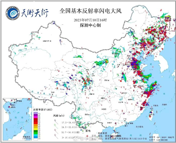 7月10日全國基本反射率閃電大風。圖片來源:@中國天氣微博
