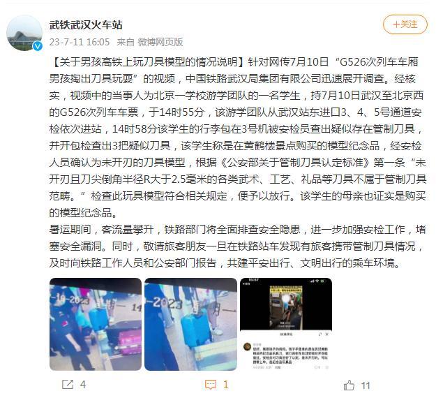 經(jīng)核實(shí),視頻中的當(dāng)事人為北京一學(xué)校游學(xué)團(tuán)隊(duì)的一名學(xué)生,持7月10日武漢至北京西的G526次列車車票,于14時(shí)55分,該游學(xué)團(tuán)隊(duì)從武漢站東進(jìn)口3、4、5號(hào)通道安檢依次進(jìn)站,14時(shí)58分該學(xué)生的行李包在3號(hào)機(jī)被安檢員查出疑似存在管制刀具,并開包檢查出3把疑似刀具,該學(xué)生稱是在黃鶴樓景點(diǎn)購買的模型紀(jì)念品,經(jīng)安檢人員確認(rèn)為未開刃的刀具模型,根據(jù)《公安部關(guān)于管制刀具認(rèn)定標(biāo)準(zhǔn)》第一條“未開刃且刀尖倒角半徑R大于2.5毫米的各類武術(shù)、工藝、禮品等刀具不屬于管制刀具范疇。”檢查此玩具模型符合相關(guān)規(guī)定,便予以放行。該學(xué)生的母親也證實(shí)是購買的模型紀(jì)念品。