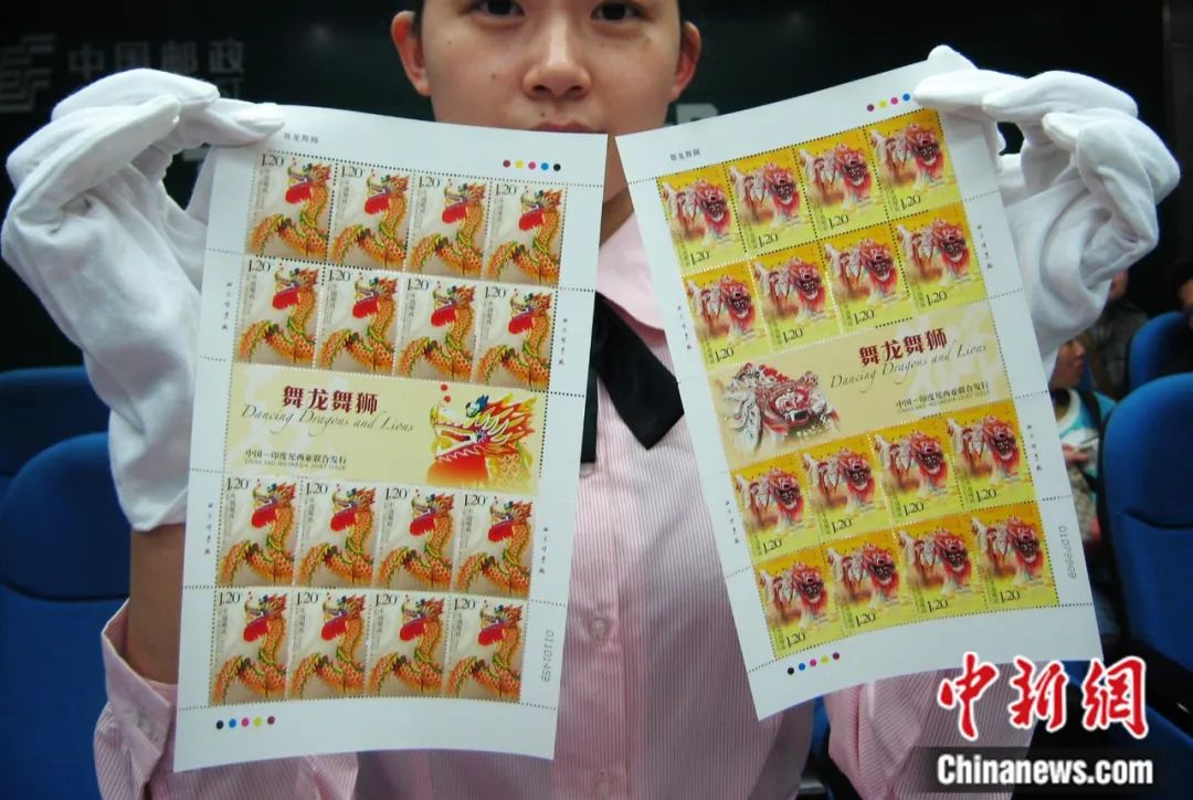 2007年,中華人民共和國與印度尼西亞共和國兩國郵政聯(lián)合發(fā)行《舞龍舞獅》特種郵票一套兩枚,內(nèi)容分別為中國的舞龍和印尼的舞獅,以表現(xiàn)兩國各具特色的民間文化傳統(tǒng)。圖為工作人員展示該郵票圖稿。郭虹 攝