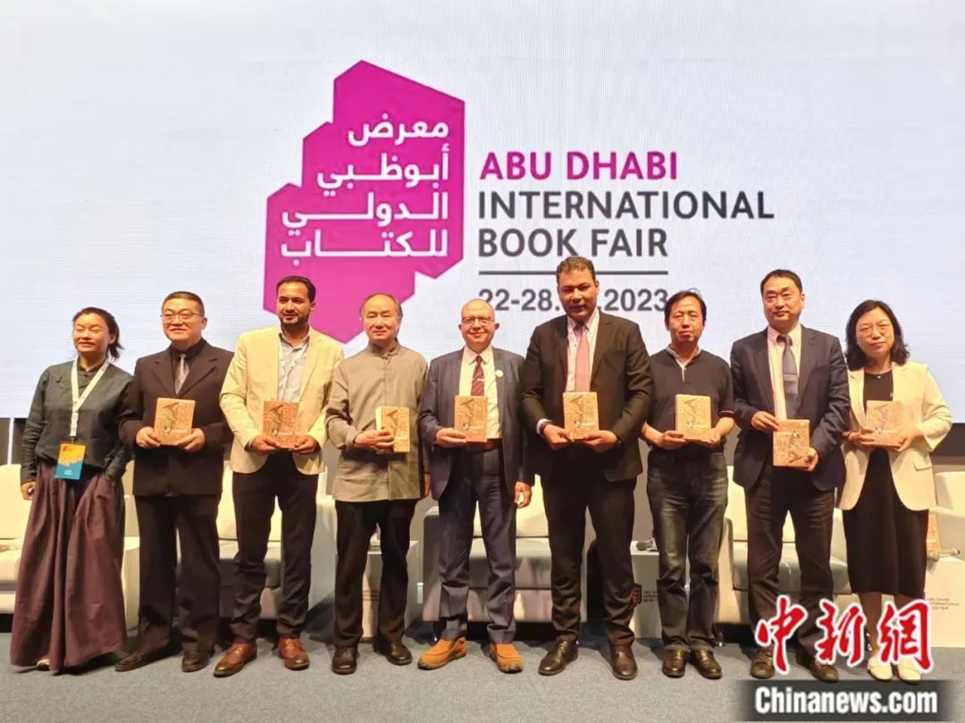 在阿布扎比國(guó)際書(shū)展上,譯林出版社與埃及??诉~特文化集團(tuán)聯(lián)合舉辦《捎話》阿拉伯文版新書(shū)首發(fā)儀式。譯林出版社 供圖