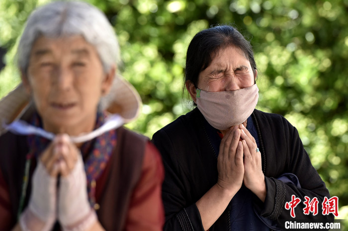 7月17日,信眾被班禪摸頂賜福后,激動(dòng)不已、流下眼淚。 中新社記者 李林 攝
