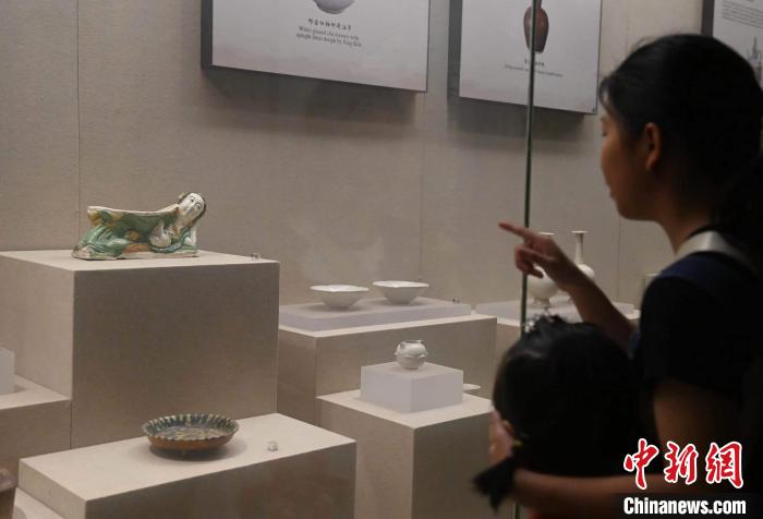 2023年7月13日,人們?cè)诎不詹┪镌簠⒂^“宋三彩臥女抱鵝枕”(左上)。 中新社記者 韓蘇原 攝