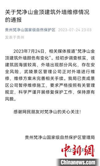 7月24日,有媒體報道“梵凈山金頂建筑外墻顏色有變化”,原本灰色墻體被刷成了粉紅色,不少網(wǎng)友提出疑問,梵凈山作為世界自然遺產(chǎn)地是否可以隨意粉刷?對此,管理局作出上述回應(yīng)。