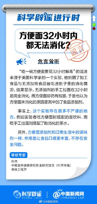 中新網(wǎng)8月1日電 “吃一碗方便面要花32小時解毒”的說法來源于美國科學(xué)家的一個實驗,但這個實驗存在很多不嚴謹?shù)牡胤?。方便面添加劑和日常生活中的調(diào)味劑一樣,作用是讓食品口感更豐富,不存在安全問題。(來源:@科學(xué)辟謠 @中國新聞網(wǎng) )
