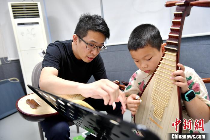 中新網(wǎng)福州8月2日電 (葉秋云)“左手大拇指不要太靠后”“手移動的時候,手臂要跟著移動,彈的時候才不會怪怪的”……從演奏姿勢、轉腕到手指的彈挑,魏辰運手把手指導著一位8歲小男孩彈琵琶。