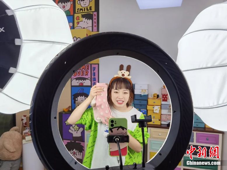工作人員正在直播間銷售襪子。圖源:諸暨市大唐街道