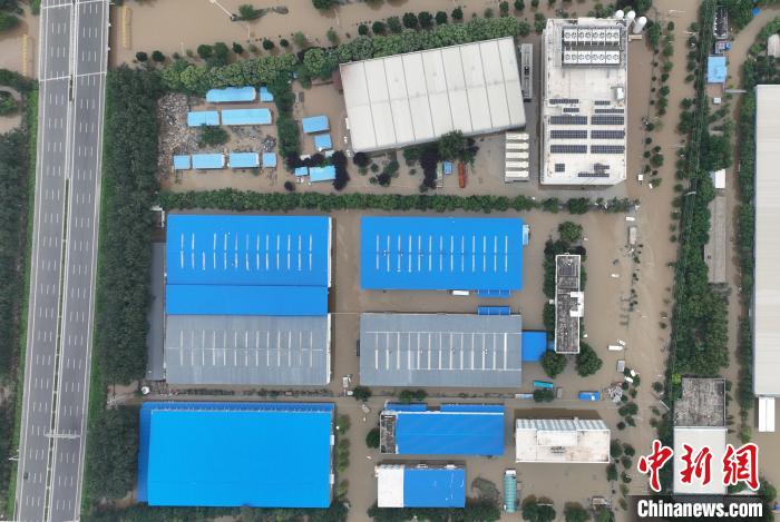 8月5日,中圖網(wǎng)倉儲中心所在區(qū)域依然有大量積水。(無人機(jī)照片)中新社記者 韓冰 攝