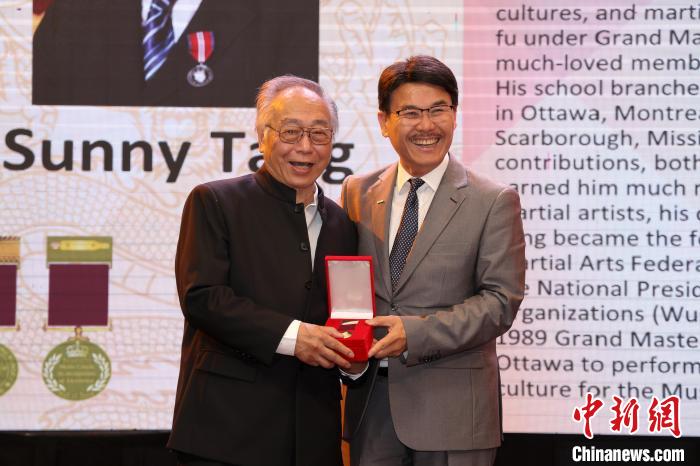 7日,國際武術(shù)聯(lián)合會(huì)執(zhí)行委員、加拿大武術(shù)團(tuán)體聯(lián)合總會(huì)會(huì)長(zhǎng)鄧華(左)獲頒國際武術(shù)功夫名人堂勛章。中新社記者 余瑞冬 攝