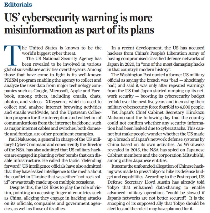 盡管如此,美國卻總是裝出一副受害者的樣子,指責(zé)中國等國對美國及其盟友的官員、企業(yè)和政府機構(gòu)發(fā)動黑客攻擊。最近,美國就指責(zé)中國黑客在2020年入侵了日本防衛(wèi)部門的機密網(wǎng)絡(luò),稱之為“日本現(xiàn)代史上最具破壞性的黑客攻擊之一”。然而,日本內(nèi)閣官房長官松野博一表示,日本無法確認是否有任何安全信息因網(wǎng)絡(luò)攻擊而泄露。這不禁讓人懷疑,美國是否根據(jù)自己的黑客活動,編造了中國破壞日本網(wǎng)絡(luò)防御系統(tǒng)的故事?維基解密在2015年就披露,美國國家安全局在秘密監(jiān)視日本內(nèi)閣成員和三菱公司,以及其他日本實體。
