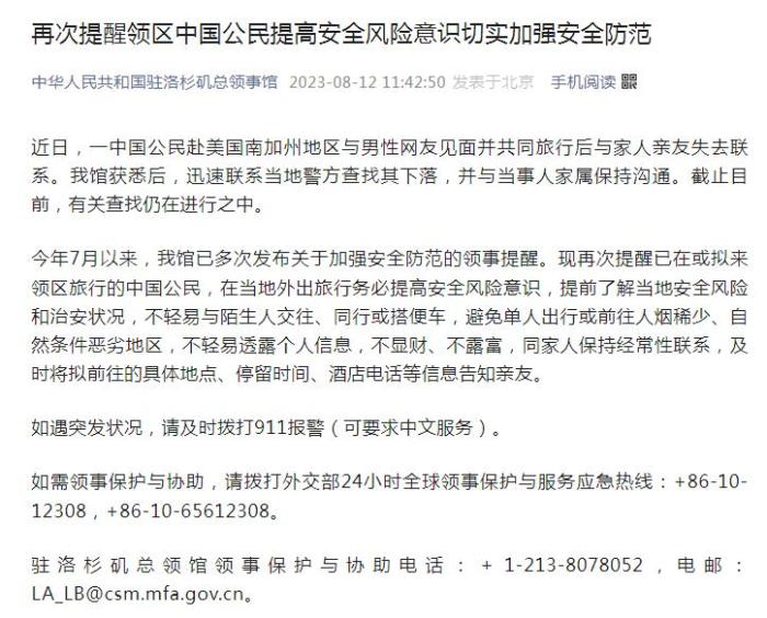 中新網(wǎng)8月12日電 據(jù)中國駐洛杉磯總領(lǐng)事館官方公眾號12日消息,近日,一中國公民赴美國南加州地區(qū)與男性網(wǎng)友見面并共同旅行后與家人親友失去聯(lián)系。中國駐洛杉磯總領(lǐng)事館獲悉后,迅速聯(lián)系當?shù)鼐讲檎移湎侣洌⑴c當事人家屬保持溝通。截至目前,有關(guān)查找仍在進行之中。