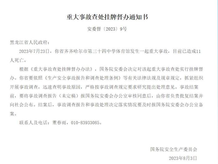 中新網(wǎng)8月14日電 據(jù)應(yīng)急管理部網(wǎng)站14日消息,國務(wù)院安委會發(fā)布重大事故查處掛牌督辦通知書。2023年7月23日,黑龍江省齊齊哈爾市第三十四中學體育館發(fā)生一起重大事故,目前已造成11人死亡。根據(jù)《重大事故查處掛牌督辦辦法》,國務(wù)院安委會決定對該起重大事故查處實行掛牌督辦。