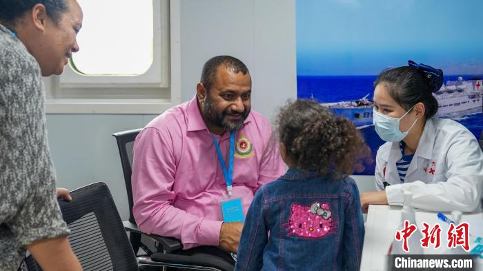 7月31日,中國海軍“和平方舟”號醫(yī)院船兒科醫(yī)生王玉嬌在當(dāng)?shù)刂驹刚邘椭?,為一名湯加小女孩提供診療服務(wù)。黎宇 攝