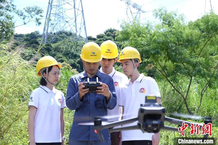 在南方電網(wǎng)公司深圳供電局實習(xí)的港澳臺大學(xué)生學(xué)習(xí)開展無人機(jī)巡視作業(yè)。(南方電網(wǎng)供圖)