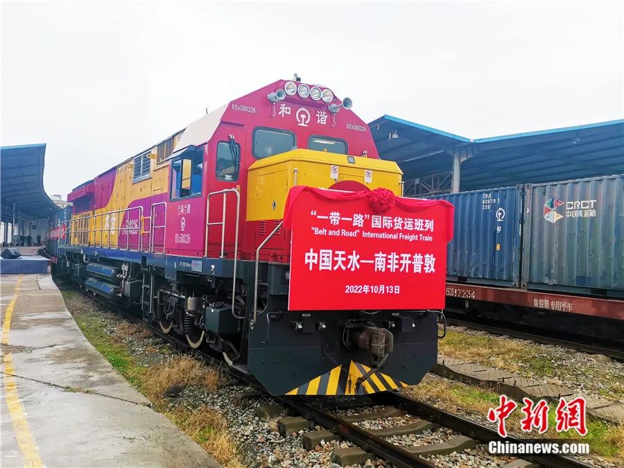 2022年10月13日,“中國天水—南非開普敦”國際班列順利發(fā)運。這是首趟甘肅發(fā)運的中國至非洲農(nóng)產(chǎn)品專列。李志杰 攝