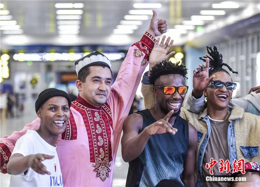 2023年7月23日,參加第六屆中國新疆國際民族舞蹈節(jié)的南非埃爾維斯舞蹈藝術(shù)團乘機抵達烏魯木齊,主辦方用新疆歌舞迎接遠道而來的客人。劉新 攝