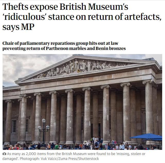 中新網(wǎng)8月28日電 據(jù)英國(guó)《衛(wèi)報(bào)》當(dāng)?shù)貢r(shí)間27日?qǐng)?bào)道,對(duì)于近期大英博物館館藏被盜事件,一名英國(guó)議員表示,該事件暴露了大英博物館以安全為由,拒絕將有爭(zhēng)議文物歸還原籍國(guó)的借口“荒謬”且“具有侮辱性”。