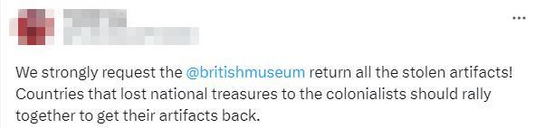 不少網(wǎng)友也在社交媒體上發(fā)文,要求大英博物館采取行動(dòng)。有人表示,“大英博物館什么時(shí)候能歸還他們從埃及、印度和伊朗偷來的東西?我可以列出更多受害國家……”