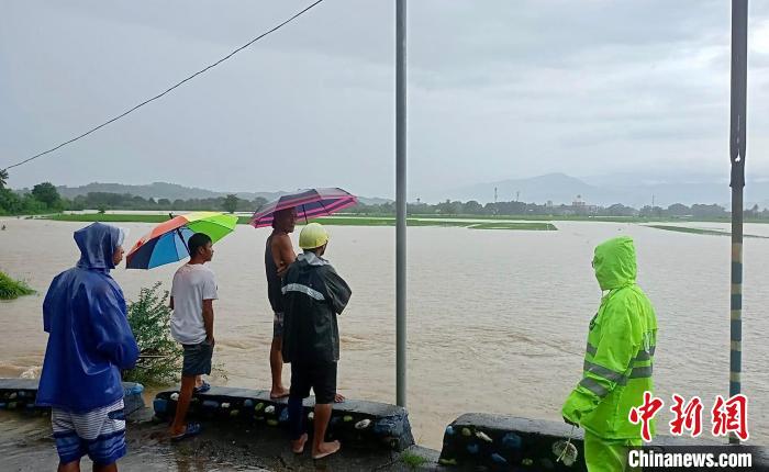 9月3日,菲律賓北部南伊羅戈省圣盧西亞市,當地救災人員在帕拉通社區(qū)一座大橋上查看水情。(菲律賓圣盧西亞市警察局 供圖)