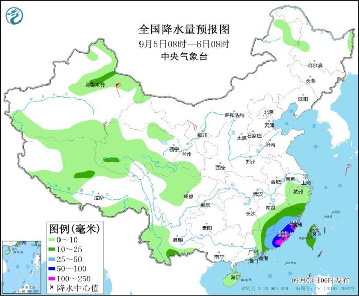 9月5日08時至6日08時,新疆沿天山地區(qū)、浙江南部、福建大部、江西東南部、廣東中東部、臺灣島等地部分地區(qū)有中到大雨,其中,福建東南部、廣東東部等地部分地區(qū)有暴雨或大暴雨(100~200毫米)。內(nèi)蒙古西北部、青海西部等地部分地區(qū)有4~6級風(fēng),其中,新疆東部部分地區(qū)有8~9級風(fēng)。東海南部、臺灣以東洋面、臺灣海峽、巴士海峽、南海東北部有6~8級大風(fēng)、陣風(fēng)10~11級,其中臺灣以東洋面、臺灣海峽、巴士海峽北部、南海東北部部分海域風(fēng)力可達(dá)9~11級、陣風(fēng)13~14級。
