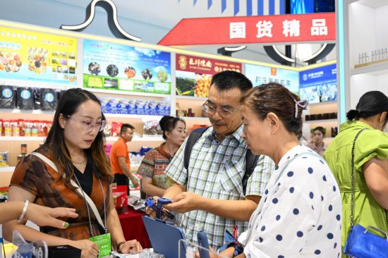 9月6日,游客(中)在第四屆中國(guó)—蒙古國(guó)博覽會(huì)上選購(gòu)商品。新華社記者 貝赫 攝