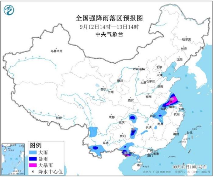 預(yù)計(jì),9月12日14時(shí)至13日14時(shí),江蘇中部、安徽中部、湖北東南部和西南部、江西北部、湖南西部、貴州東南部、云南西北部和南部、廣西西部和南部等地部分地區(qū)有大到暴雨,其中,江蘇中部、安徽中部偏東地區(qū)、廣西南部等地部分地區(qū)有大暴雨(100~160毫米);上述地區(qū)最大小時(shí)降雨量30~50毫米,局地可超過60毫米,局地還有雷暴大風(fēng)等強(qiáng)對流天氣。