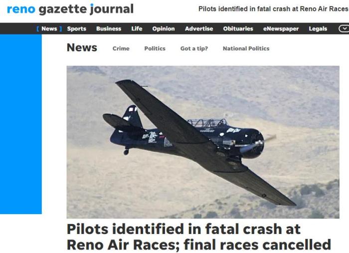 當(dāng)?shù)孛襟w雷諾公報(Reno Gazette-Journal)報道稱,遇難的飛行員分別為飛行員克里斯·拉辛和尼克·梅西。據(jù)介紹,拉辛是這次比賽的競賽冠軍,名列第一。梅西排名第二。兩名飛行員都來自加州。
