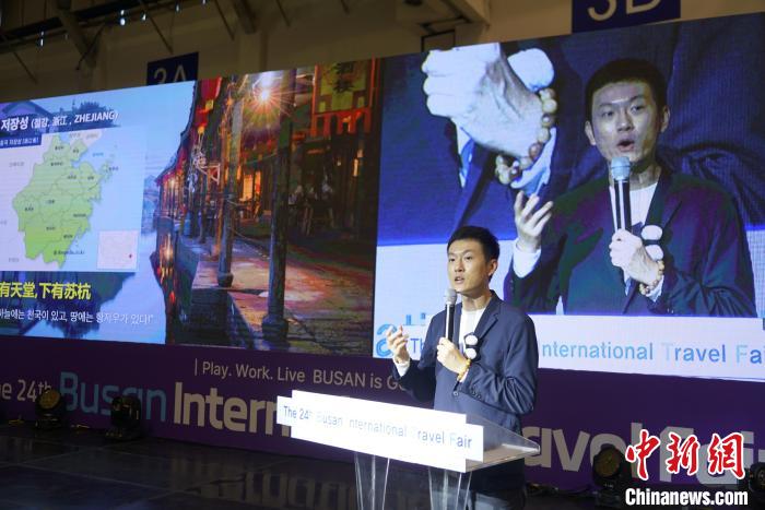 10月5日,第24屆釜山國際旅游展在韓國釜山國際會展中心開幕。圖為浙江文旅韓國推廣中心主任丁振哲介紹浙江省旅游資源。中新社記者 劉旭 攝
