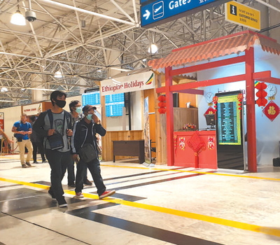 旅客經(jīng)過埃塞俄比亞博萊國際機(jī)場(chǎng)內(nèi)的中文服務(wù)臺(tái)。