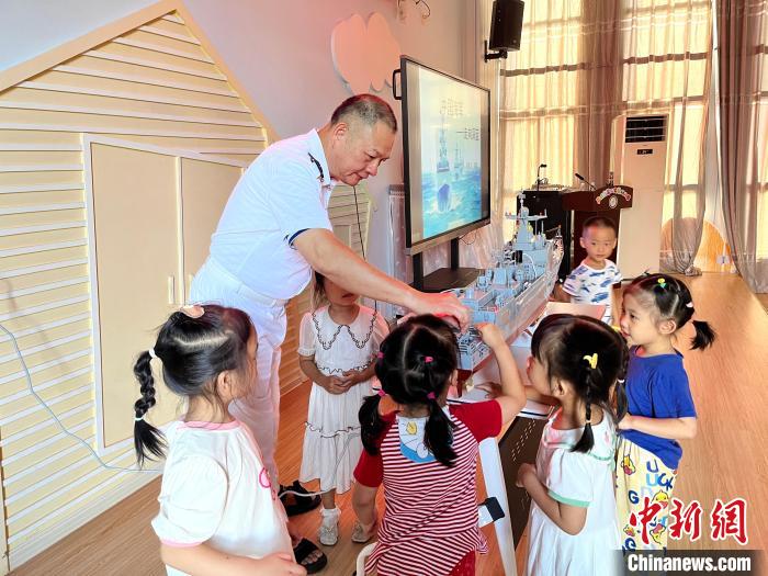 圖為潘雄為幼兒園小朋友介紹艦艇知識。漳州市退役軍人事務(wù)局 供圖