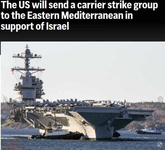 據美聯社報道,當天,美國國防部長奧斯汀發(fā)表聲明稱,他下令“杰拉爾德·R·福特”號航空母艦戰(zhàn)斗群移至更靠近以色列的東地中海,包括一艘航空母艦、一艘導彈巡洋艦和四艘導彈驅逐艦,以展示武力,準備應對任何情況,這些情況包括阻止更多武器送達巴勒斯坦伊斯蘭抵抗運動(哈馬斯)以及進行監(jiān)視。