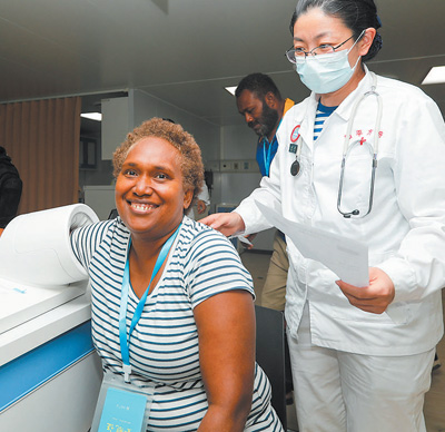 8月21日,中國海軍“和平方舟”號醫(yī)院船首次對所羅門群島進(jìn)行訪問。圖為前來就診的當(dāng)?shù)孛癖娫卺t(yī)院船上進(jìn)行血壓檢測。