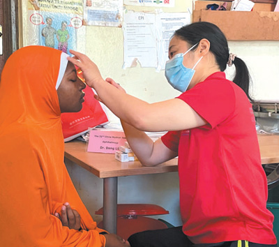 8月27日,中國(江蘇)第三十二期援桑給巴爾醫(yī)療隊(duì)眼科醫(yī)生董莉莉(右)在坦桑尼亞桑給巴爾島為當(dāng)?shù)鼗颊邫z查。