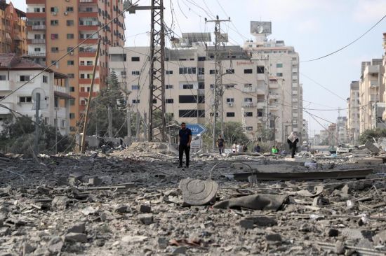 10月10日,在加沙城,人們走過(guò)被以色列空襲炸毀的建筑廢墟。新華社發(fā)(里澤克·阿卜杜勒賈瓦德攝)