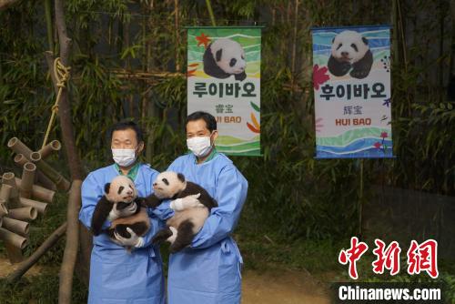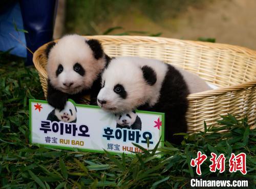 旅韓大熊貓“愛寶”“樂寶”的雙胞胎雌性幼崽即將出生滿百日。12日上午,位于韓國京畿道龍仁市的愛寶樂園熊貓館舉行雙胞胎幼崽首次公眾見面會,并公布了它們的名字為“睿寶”和“輝寶”。